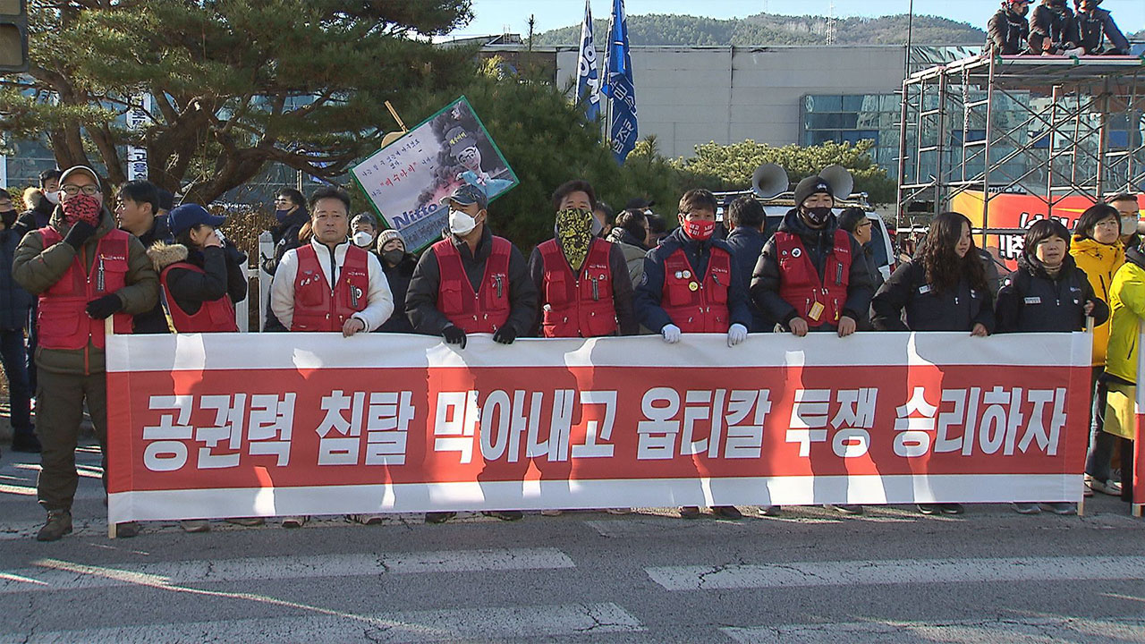 경북 구미 일본계 외국인 투자 기업인 한국옵티칼하이테크가 청산절차를 밟자 노동자 2명이 40일이 넘도록 공장 옥상에서 농성을 하고 있습니다. 한국옵티칼은 일본계 다국적 기업인 닛토덴코의 자회사로 외국인투자촉진법에 따라 지난 2003년 경북 구미 4공단에 공장을 설립한 후 LCD(액정표시장치) 핵심 부품인 편광필름을 생산해 LG디스플레이에 납품해 왔습니다. 하지만 2023년 10월 화재가 발생한 후 한 달 만에 주주총회를 거쳐 해산결의를 하고, 200여 명의 노동자들에게 희망퇴직을 신청하라고 통보했습니다. 직원 130여 명은 이를 받아들였지만 희망퇴직을 거부한 17명은 해고됐습니다. 해고된 노동자들은 고용승계를 요구하며 농성에 들어갔고 현재는 11명이 공장에서 농성을 벌이고 있습니다. 그 가운데 여성 노동자 2명이 1월 8일부터 공장 옥상에 올라가 농성을 벌이고 있습니다.