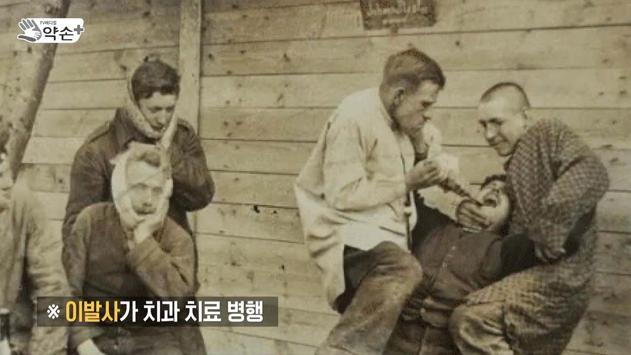 왼쪽 사진을 보시면요. 19세기 이전의 치과 모습을 나타낸 사진입니다. 사람들이 굉장히 고통스러워하고 있죠. 저 때에는 치과 의사 양성을 따로 하지 않았다고 합니다. 머리를 깎는 이발사들이 치아 발치라든지, 작은 수술이라든지 그런 것들을 병행했다고 합니다.