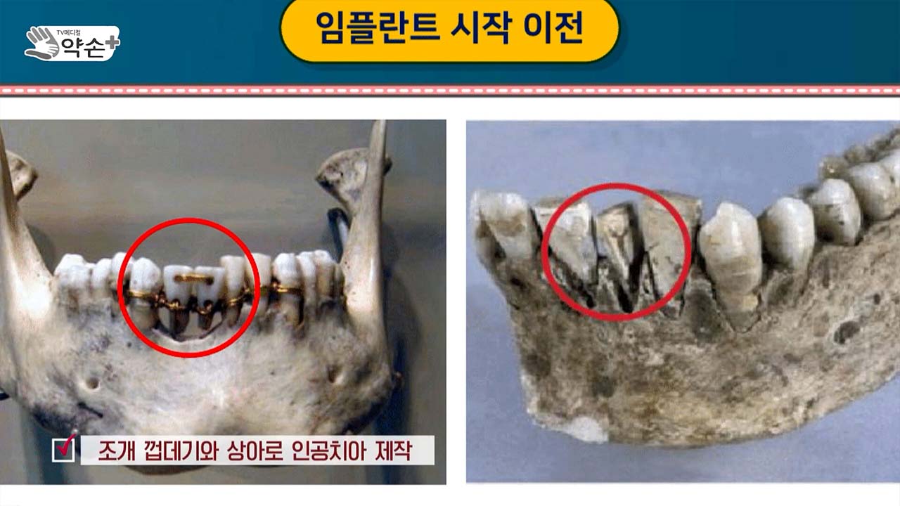 그렇다면 임플란트 시작 이전에는 어땠을까요? 놀랍게도 임플란트 전에도 상실된 치아를 수복하기 위한 끊임없는 시도가 있었다고 합니다. 고대 기록을 보면 조개껍질이라든지 상아를 깎아서 치아 모형을 모방하고 연결해서 썼다고 합니다.