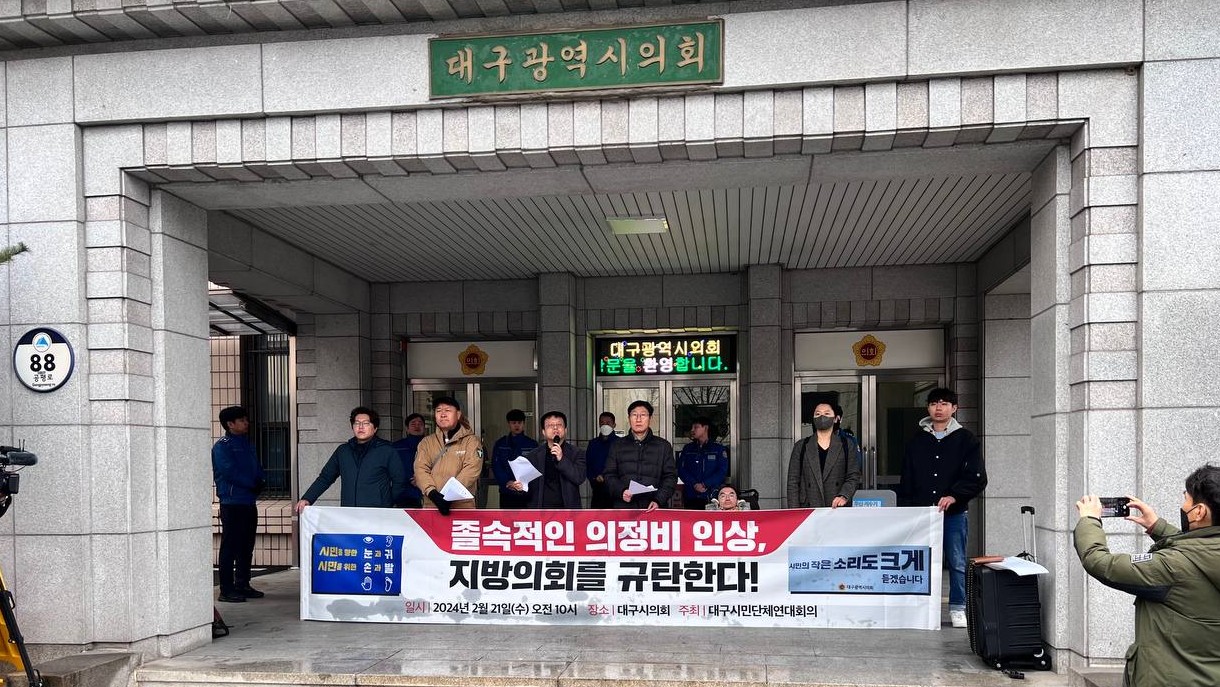 대구시민단체연대회의는 "경기 침체와 인구 감소 등으로 세수가 줄고 지방 재정이 악화하고 있을 뿐 아니라 의원 일탈과 집행부 견제 부실로 비판받는 지방의회가 너도나도 의정 활동비부터 올리는 건 민생을 외면한 몰염치한 담합"이라고 규탄했습니다.