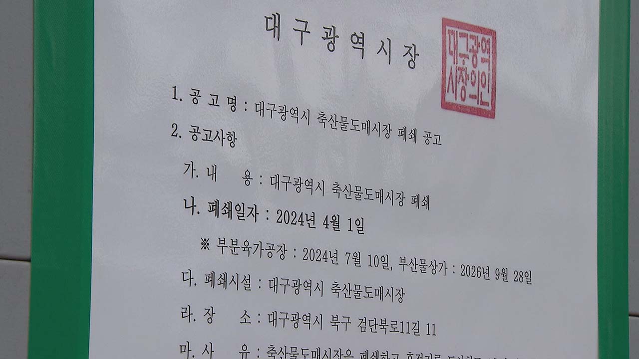 대구시는 대구 축산물도매시장이 20년도 전인 2001년 5월 지어져 시설이 오래되고 낡아서 시설 개보수에 비용이 많이 들고, 외곽 지역으로 이전하더라도 천문학적 비용이 들어 계속 운영하기 어렵다고 봤습니다. 또 대구와 가까운 경북 8개 시군에 도축장이 있어 축산물 유통에는 문제가 없다는 견해도 곁들여졌습니다. 결국 대구시는 축산물도매시장 폐쇄를 결정했고 대구시의회에서 지난 1월 말 관련 조례를 통과시켰습니다.