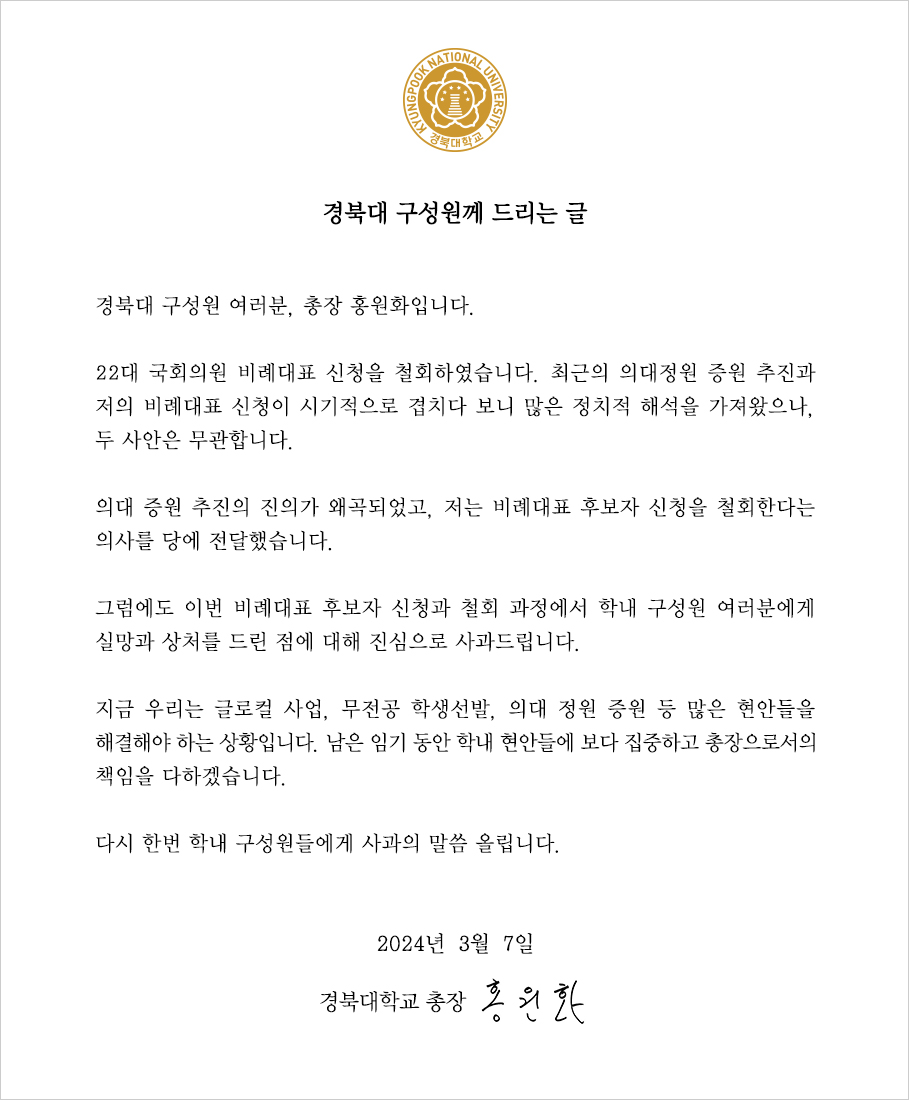 그러면서 "의대 정원 증원 추진과 비례 대표 후보자 신청은 무관하다"라며 남은 임기 동안 총장으로서 책임을 다하겠다"라고 덧붙였습니다.