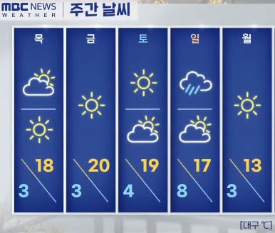 특히 금요일에는 대구의 낮 기온이 20도까지 껑충 오르겠고요.