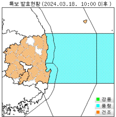 ▶ 건조주의보 : 경상북도(청도, 고령, 영양평지, 봉화 평지 제외), 대구(군위 제외), 울릉도, 독도