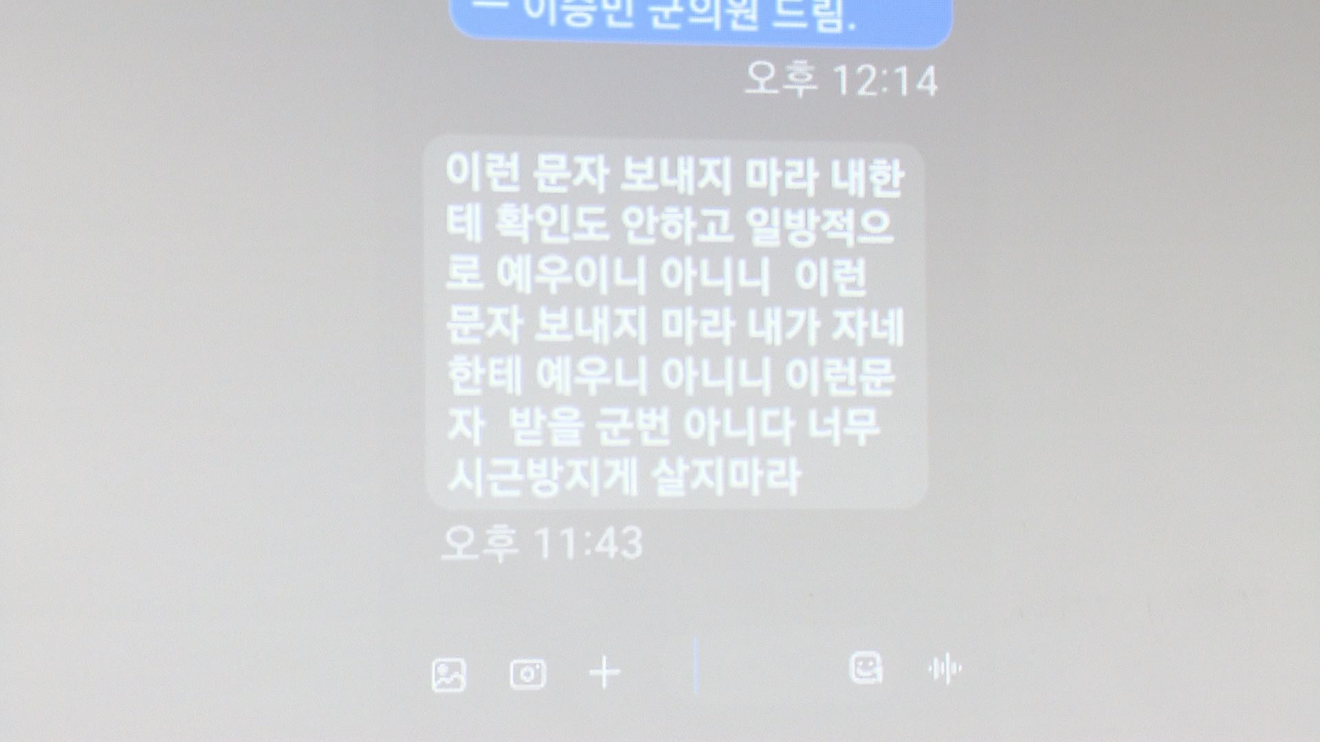 이승민 청도군의회 의원 "이런 문자 보내지 마라. 나한테 확인도 안 하고 일방적인 예우니 아니니 이런 문자 보내지 마라. 내가 자네한테 예우니 아니니 이런 문자 받을 군번 아니다. 너무 시건방지게 살지 마라."