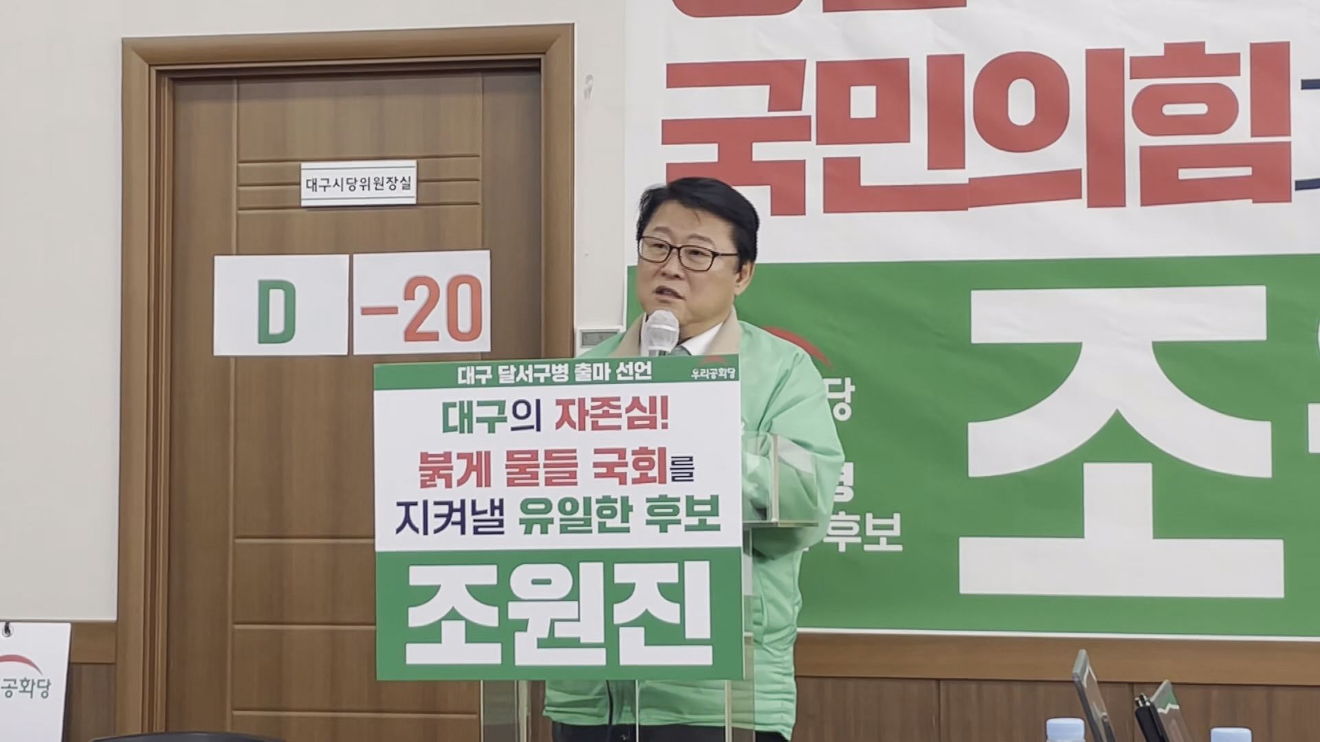 조 후보는 출정식에서 "달서구민과 힘을 모아 대구시 신청사를 유치한 조원진이 신청사를 반드시 원안대로 완공하겠다"라고 밝혔습니다.