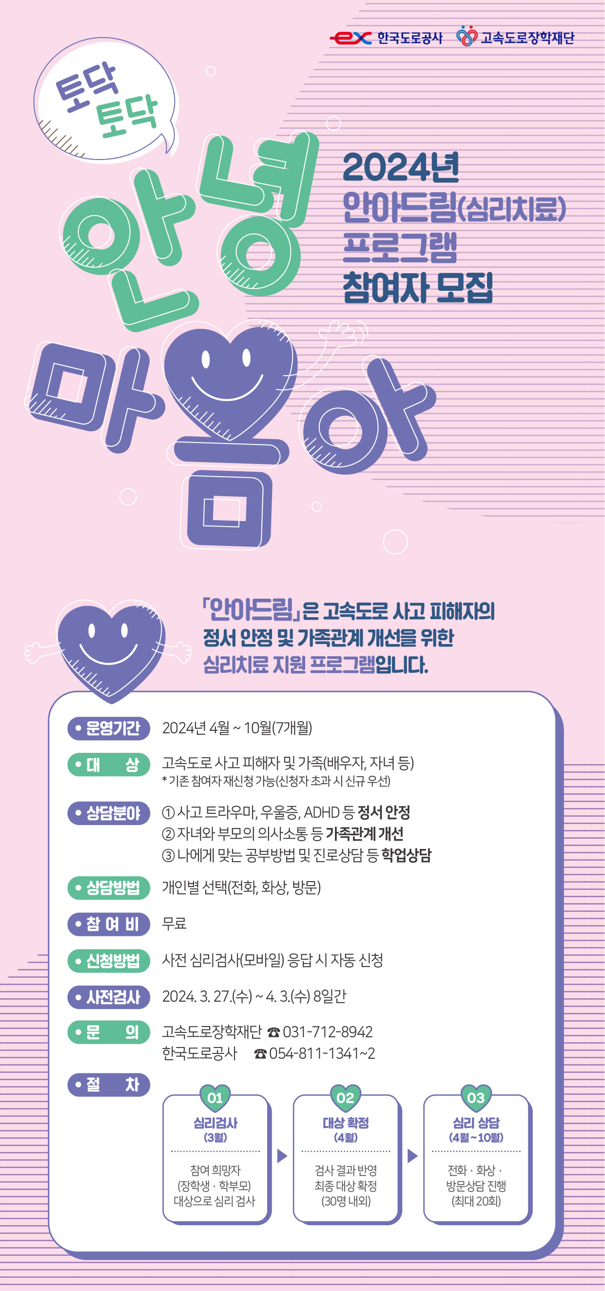 '안아드림'이라는 이 프로그램은 고속도로 사고 후유증으로 심리적 어려움을 겪고 있는 사람들에게 정서적 안정을 주고 가족관계 개선에 도움을 주기 위해 마련됐습니다.