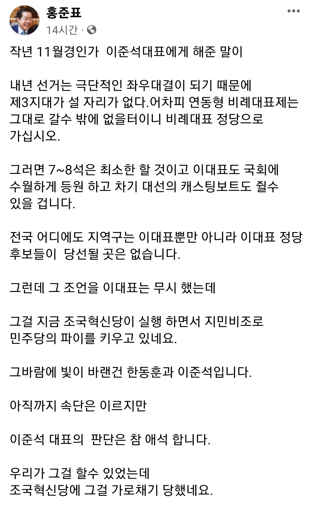 홍 시장은 자신의 조언을 듣지 않은 이준석 대표의 판단이 애석하다며 조국혁신당에 가로채기 당했다는 아쉬움을 나타냈습니다.
