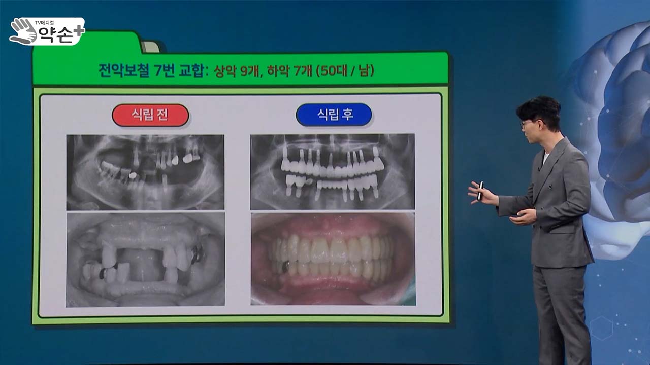 사례를 보다 보면 지금 틀니를 착용하고 계신 분들도 '정말 예후가 좋다, 나도 하고 싶다.' 이런 생각이 드실 수도 있을 것 같아요. 그런데 틀니를 장시간 착용하신 분들 같은 경우에는 임플란트가 좀 어렵다 이런 이야기도 있더라고요?