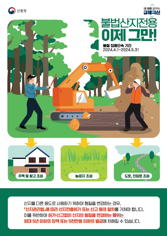 몰래 나무를 베어 가거나 산나물, 약초 등 임산물을 채취하는 경우, 허가 없이 산에 농경지를 조성하고 진입로를 만들어 산림의 형질을 바꾸는 경우 등으로 적발되면 관련 법에 따라 엄중 조치합니다.