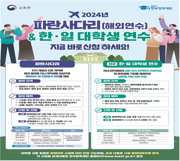한국장학재단은 학생들에게 해외연수 기회를 제공하는 '한 일 대학생 연수'와 '파란 사다리' 사업 참여 대학 명단을 발표했습니다.