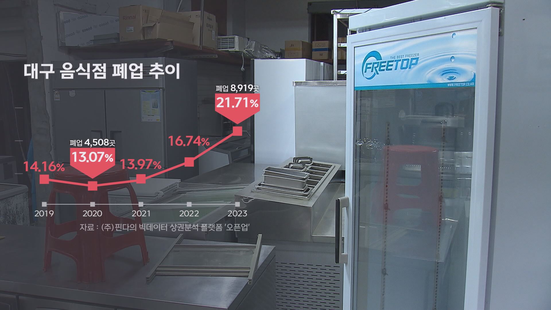 핀테크 기업 핀다의 빅데이터 상권분석 플랫폼 '오픈업'에 따르면 지난해 대구에서만 음식점 8,919곳이 문을 닫았습니다.