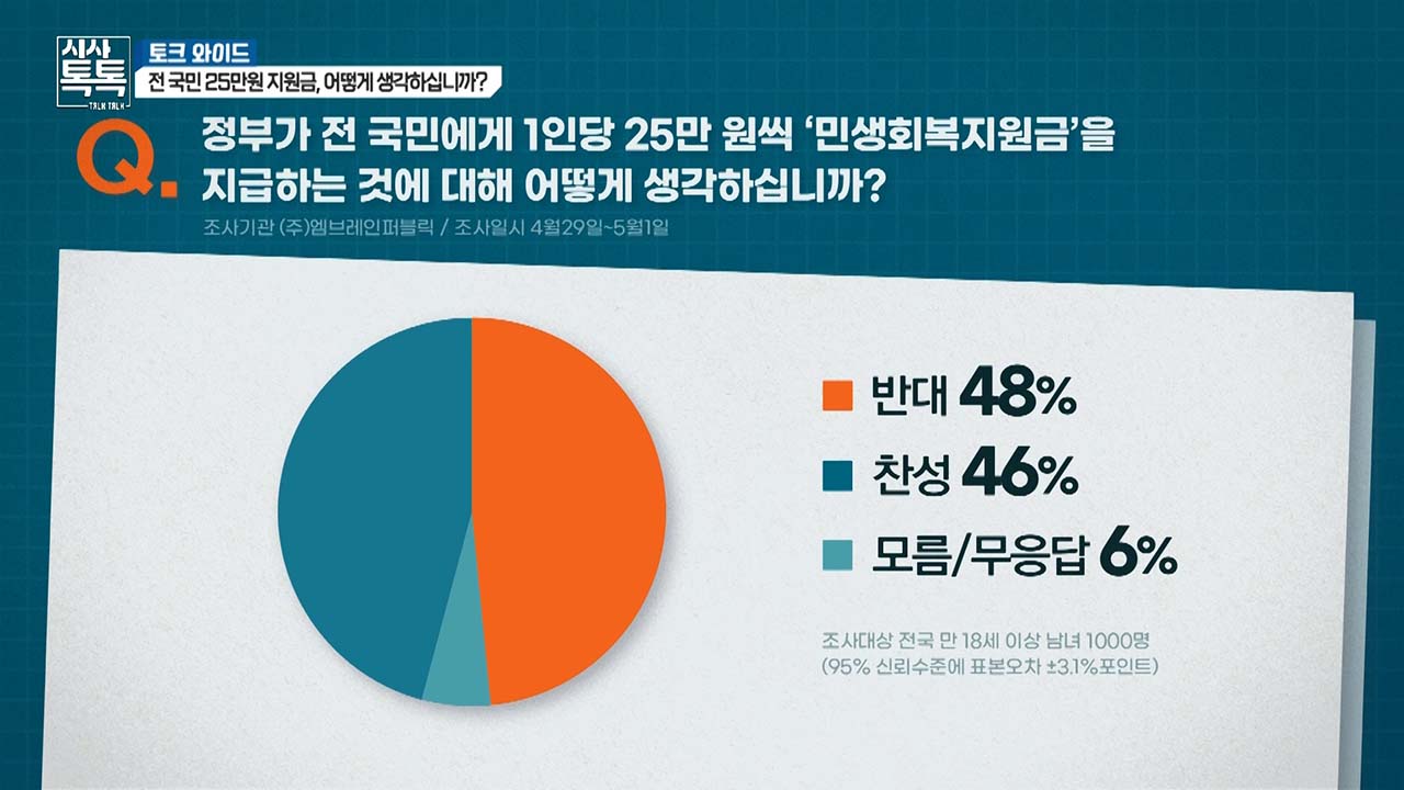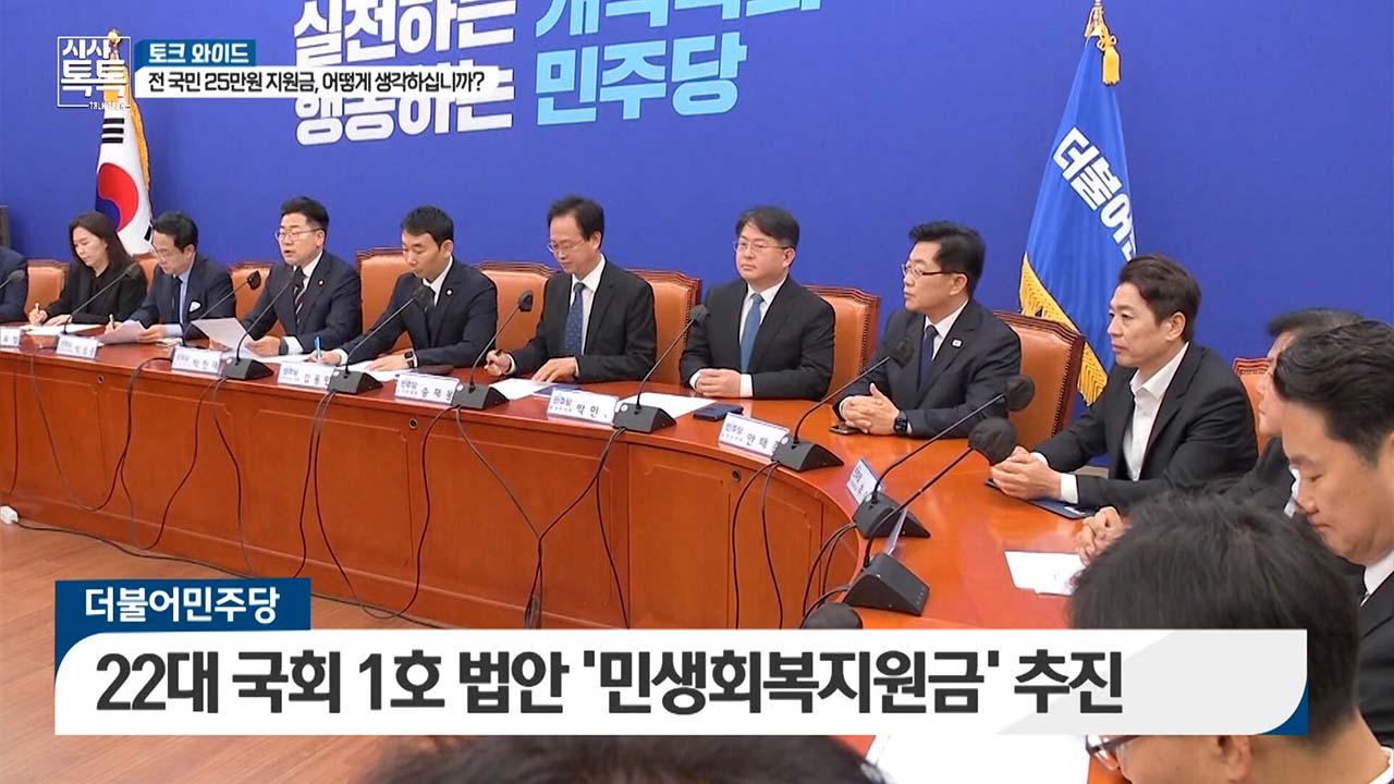 지난달 29일부터 사흘 간 실시한 한 여론조사에서 '전 국민 25 만원 지급'에 대해 찬성이 46%, 반대가 48% 로 팽팽한 것으로 나타났습니다. 국내에서는 코로나19 대유행 당시 소득 수준이나 재산 규모와 상관없이 모든 국민을 대상으로 동일한 금액을 '재난지원금'으로 지원한 사례가 있습니다. 22대 첫 법안으로 실행하겠다는 거대 야당과 공감하지 않은 여당 사이에서 '전 국민 25만 원' 민생회복지원금은 한동안 논란이 될 전망입니다. 시사톡톡 김은혜입니다.