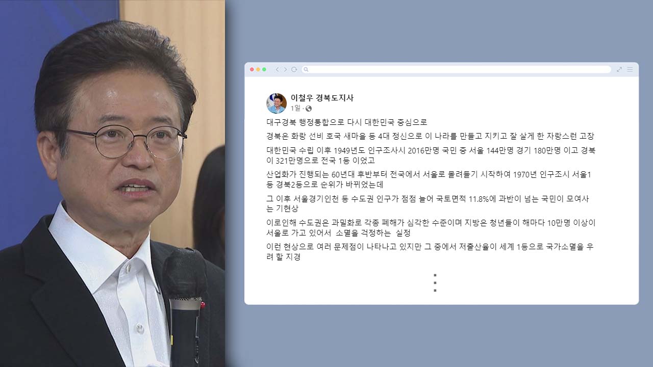 이철우 경상북도지사는 "수도권 일극 체제로는 저출생 문제라든지 지방소멸 문제를 해결할 수 없기 때문에 지방 활성화를 통해서 이런 문제들을 해결해야 하고 대구·경북 통합할 때 경찰이라든지 교육감 선거라든지 자치권을 완전 통합해서 완전 자치를 해야 하고 국가에서 관리하는 대학이라든지 환경문제라든지 산업단지 문제 이런 것까지 다 지방으로 내려오는 완전 분권을 해야 한다고 생각합니다."라며 대구·경북 통합을 적극 지지하고 나섰습니다.