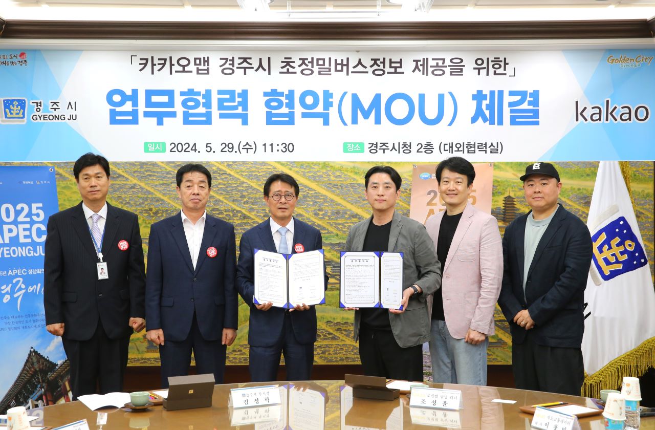 경주시는 5월 29일 시청에서 카카오와 업무협약을 맺고 2024년 하반기부터 카카오맵 앱에서 경주 시내버스 위치 정보와 도착 예정 시간, 노선 등 초정밀 버스정보를 제공하는 업무협약을 맺었습니다.