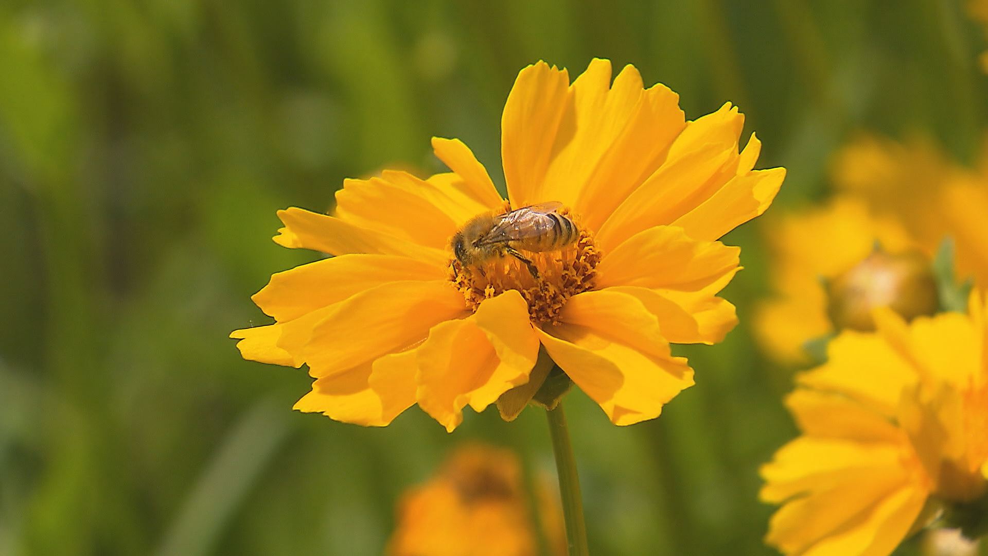 거대한 규모의 큰금계국 군락지의 꽃은 벌과 나비를 끌어들입니다.