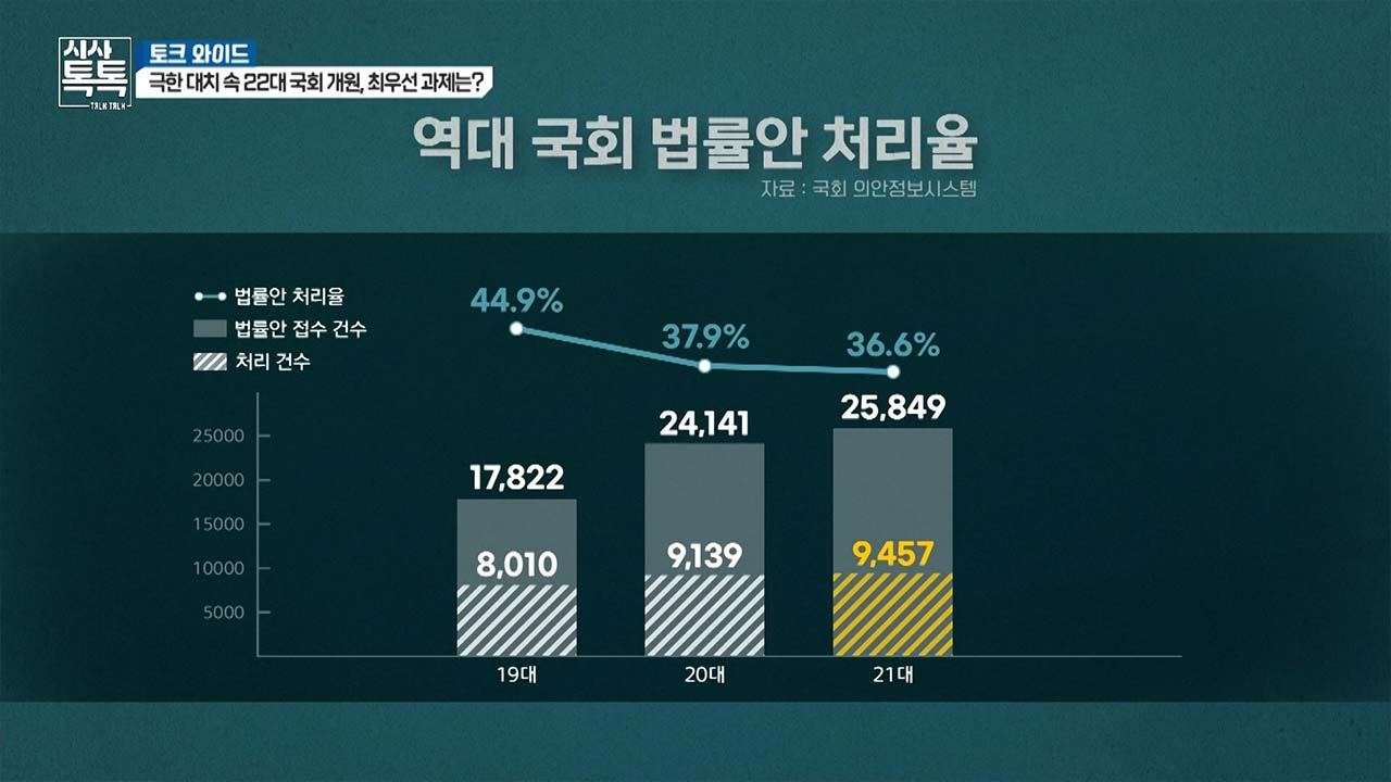 제가 20대 국회였지 않습니까? 20대 국회를 마칠 때도 역대 최악의 국회였다고 평가를 했었어요. 21대 국회도 역대 최악의 국회라고 평가를 하지 않습니까? 처리율만 놓고 보면 떨어졌지만, 처리 건수만 보면 오히려 늘었거든요. 보니까 20대 국회에서는 처리한 법안이 9,139건, 그런데 21대는 9,455건. 꽤 의미 있게 늘었단 말이에요, 오히려. 그러면 이제 우리가 생각을 해봐야죠. 21대 국회도 그렇고 20대 국회도 그렇고 9,000건이 넘는 법안을 발의하고 통과를 시켰는데, 통과시킨 게 그만큼 되는데, 세상이 그만큼 변화하고 나아졌는가를 생각하면 뭐야 싶단 말이에요.