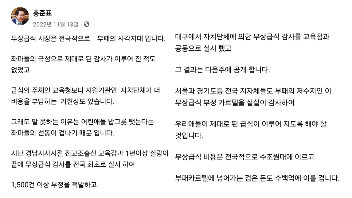 2022년 11월 홍준표 대구시장은 SNS에 학교 무상급식 관련 글을 하나 올렸습니다.
