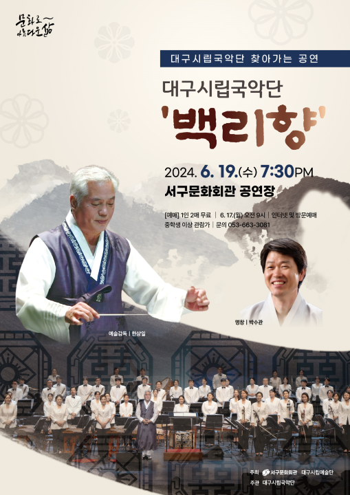 대구시립국악단은 대중이 쉽게 들을 수 있는 프로그램으로 구성한 '백리향'을 6월 19일 저녁 7시 30분 서구문화회관에서 공연합니다.