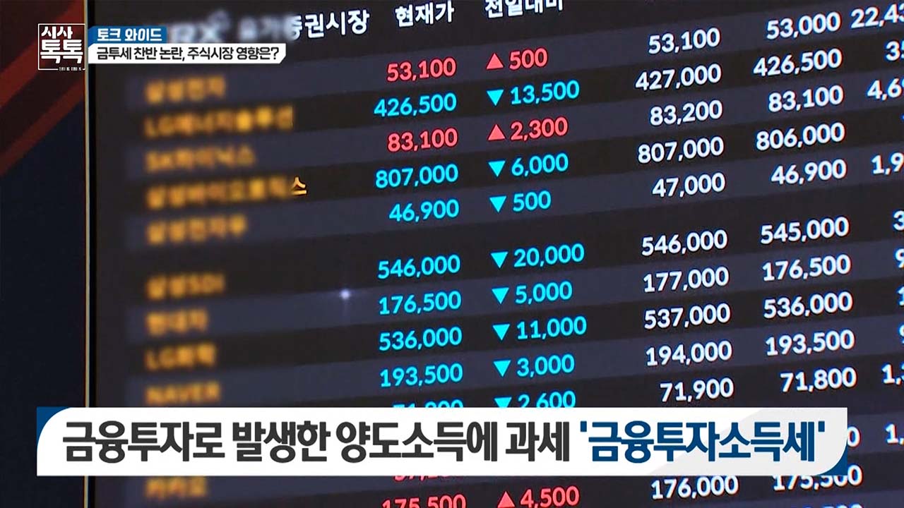 2025년 1월 시행을 앞둔 금융투자소득세를 둘러싼 찬반 논란이 뜨겁습니다. 금투세는 주식, 채권 등 금융 투자상품에 투자해 연간 5,000만 원이 넘는 수익을 낸 투자자들에게 소득세를 매기는 것입니다. 2024년 1월에는 윤석열 대통령이 금투세 폐지를 언급한 뒤 정부와 여당은 폐지를 추진하고 있지만 야당의 반대 등으로 금투세의 향방은 예측하기 어려운 상황입니다. 이번 주 시사톡톡에서는 금투세 찬반 논란의 핵심 쟁점과 주식시장에 미치는 영향을 중심으로 토론하는 시간을 마련했습니다.