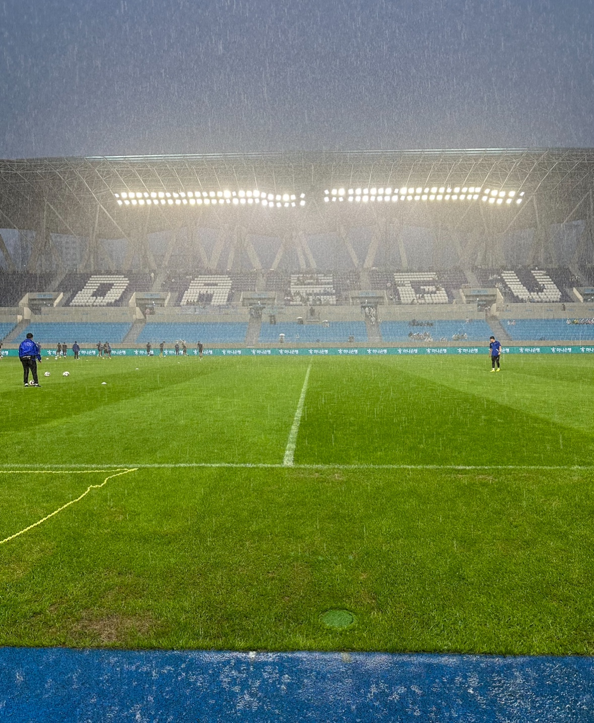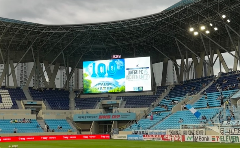 장마로 인해 경기 시작 한 시간 전부터 빗줄기가 굵어진 가운데 DGB대구은행파크 100번째 K리그가 펼쳐집니다.