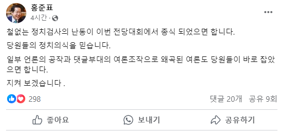 홍 시장은 7월 20일 자신의 SNS를 통해 "당원들의 정치의식을 믿는다"며 "일부 언론의 공작과 댓글부대의 여론조작으로 왜곡된 여론도 당원들이 바로잡았으면 한다, 지켜보겠다"고 말했습니다.