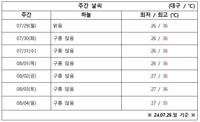 7월 5주 차 아침 기온 26도에서 27도, 낮 기온 35도에서 36도 예상됩니다.