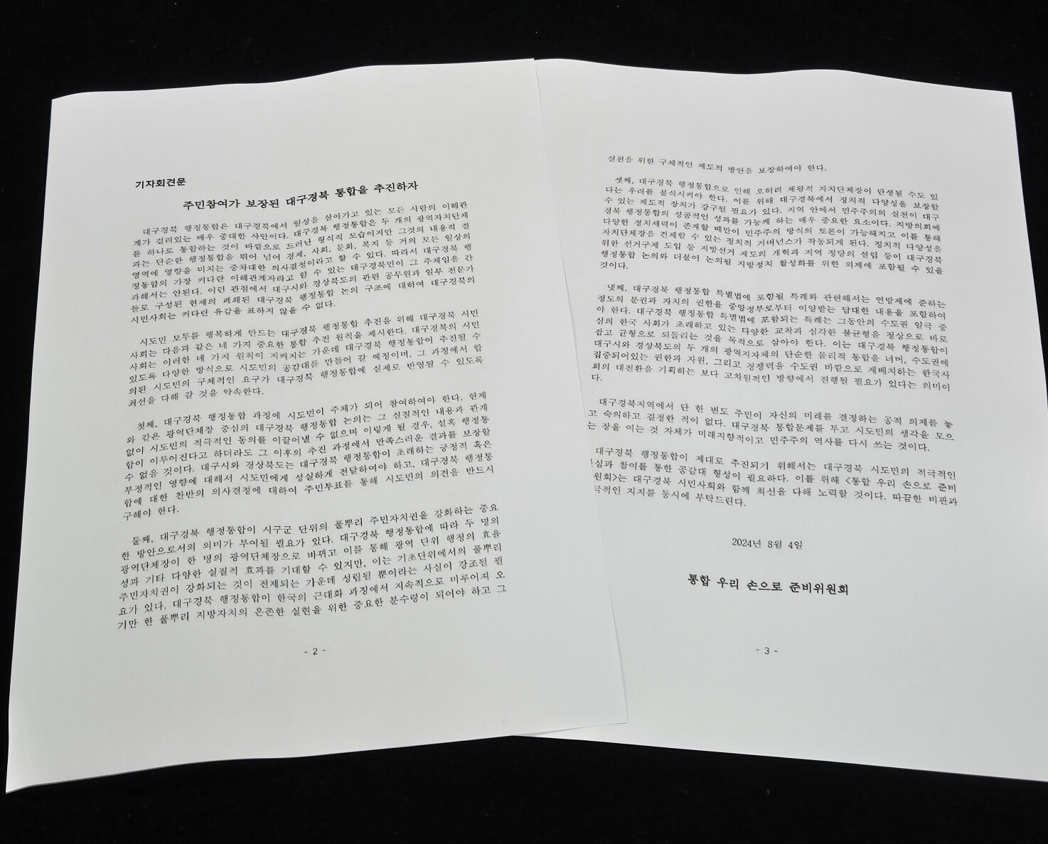 이들은 구체적으로 대구·경북 행정 통합 과정에 시도민이 주체가 돼야 하며 연방제에 준하는 권한 이양을 비롯한 풀뿌리 민주주의 강화 등 네 가지 원칙을 제시하고 주민 참여 보장을 요구했습니다.