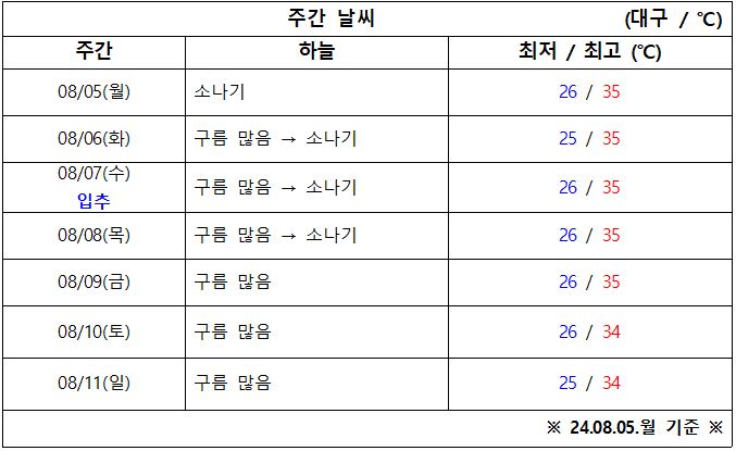 8월 1주 차 아침 기온 25도에서 26도, 낮 기온 34도에서 35도 예상됩니다.