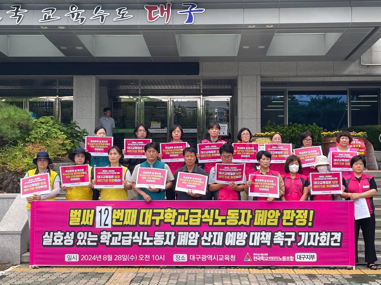 전국 학교 비정규직노동조합 대구지부는 8월 28일 오전 대구시교육청 본관 앞에서 기자회견을 열고 학교급식 노동자의 폐암 산재 예방 대책을 촉구했습니다.