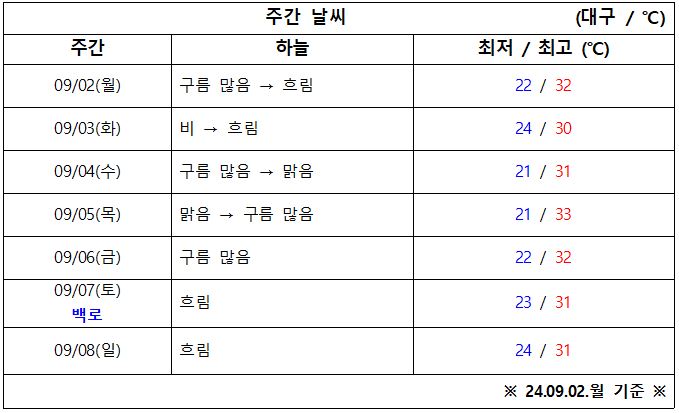 9월 1주 차 아침 기온 21도에서 24도, 낮 기온 30도에서 32도 예상됩니다.