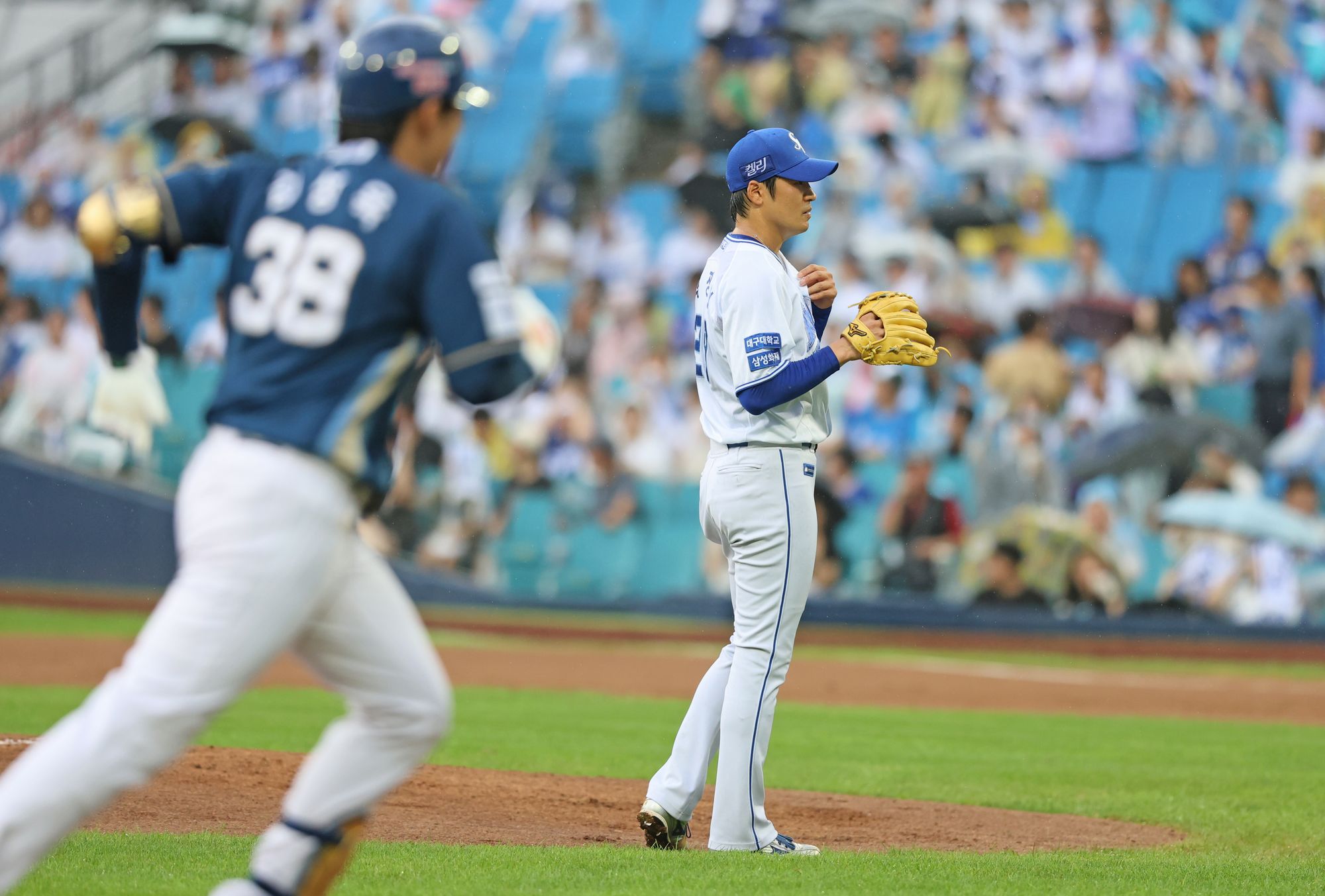 하지만, 첫 타자를 깔끔하게 처리한 이후 백정현은 3타자 연속 안타로 선취점을 내줬고, 2아웃 이후 김성욱에게 3점 홈런을 허용해 경기를 어렵게 시작합니다.