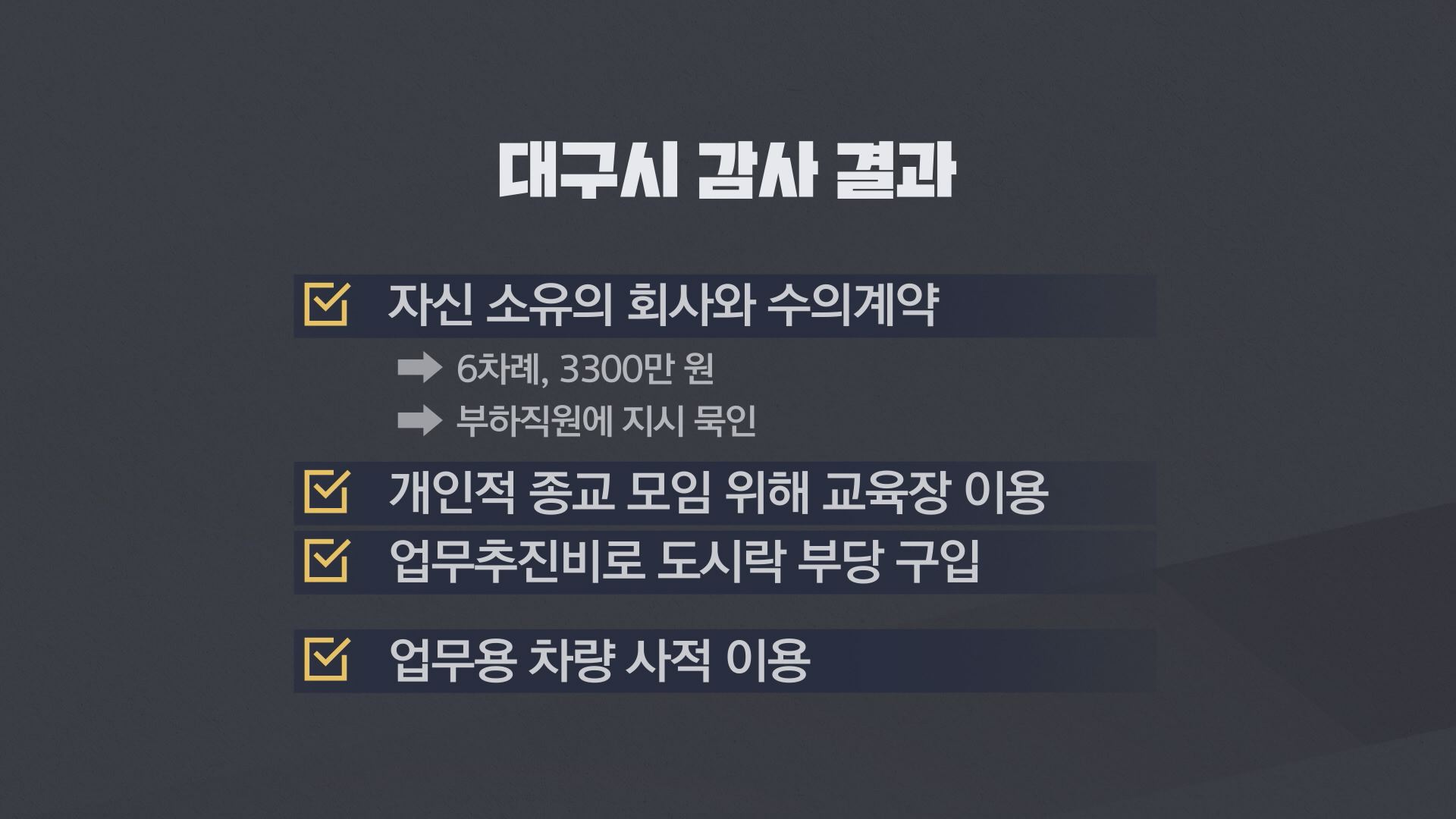 대구시 감사위원회가 공개한 '2024년도 정기 종합 감사 결과' 자료에 따르면 지난 6월 3일부터 열흘간 해당 기관의 업무 추진 전반을 점검한 결과, 행정상 위법·부당행위 24건이 확인됐습니다.