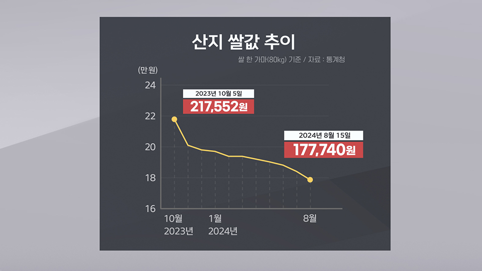 자료를 보시면, 쌀 한 가마, 80kg 기준으로 지난해 21만 원을 넘던 쌀값은 최근 17만 원 대로 떨어졌습니다.