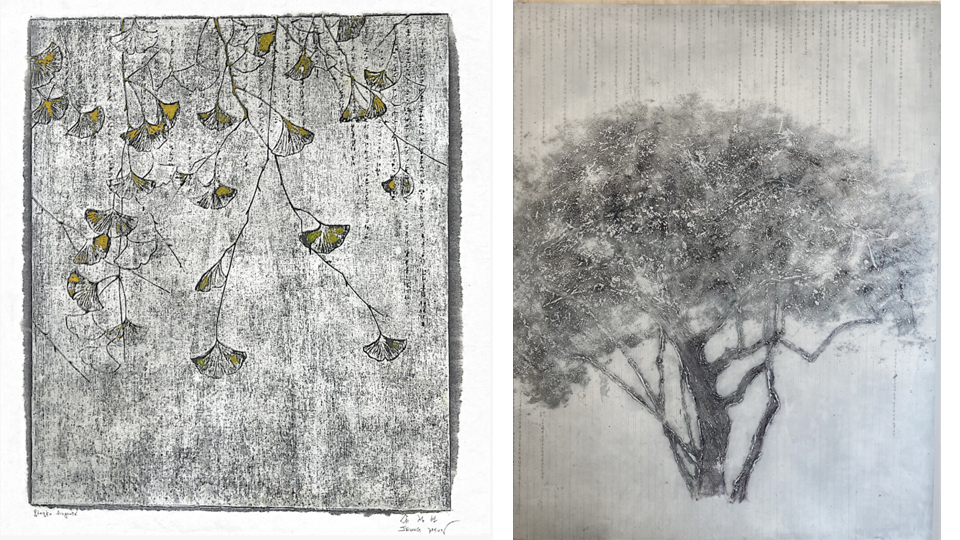 판화의 제작 과정을 거치면서 회화에 가까운 결과를 얻는데 두 장르의 융합과 동양화의 느낌을 내고 있습니다.