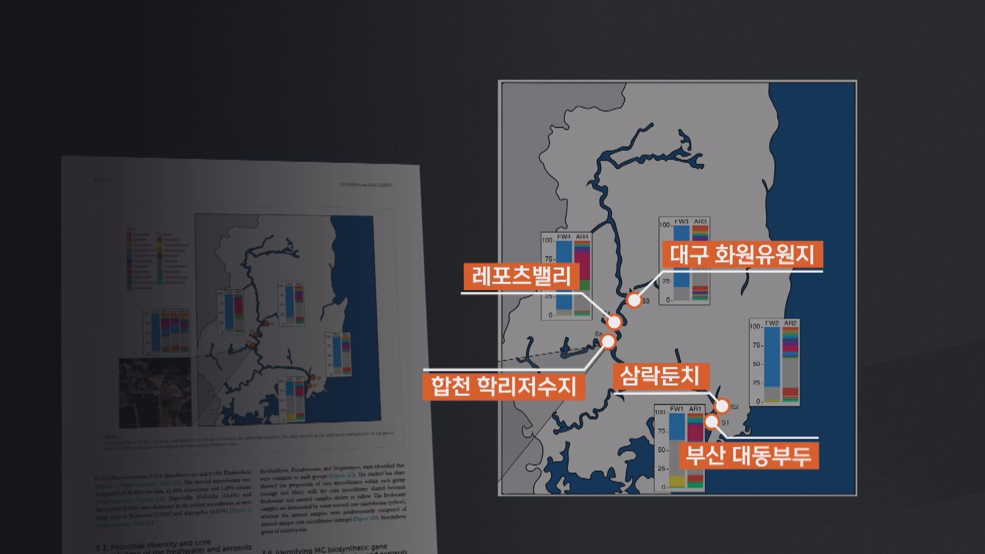 연구팀이 2022년 8월 30일과 9월 2일 이틀 동안 대구 화원유원지와 레포츠 벨리, 합천 학리 저수지, 부산 대동 부두와 삼락둔치 등 5곳에서 에어로졸 조사를 한 결과 m3당 0.1~3.68나노그램 농도로 검출된 것입니다.