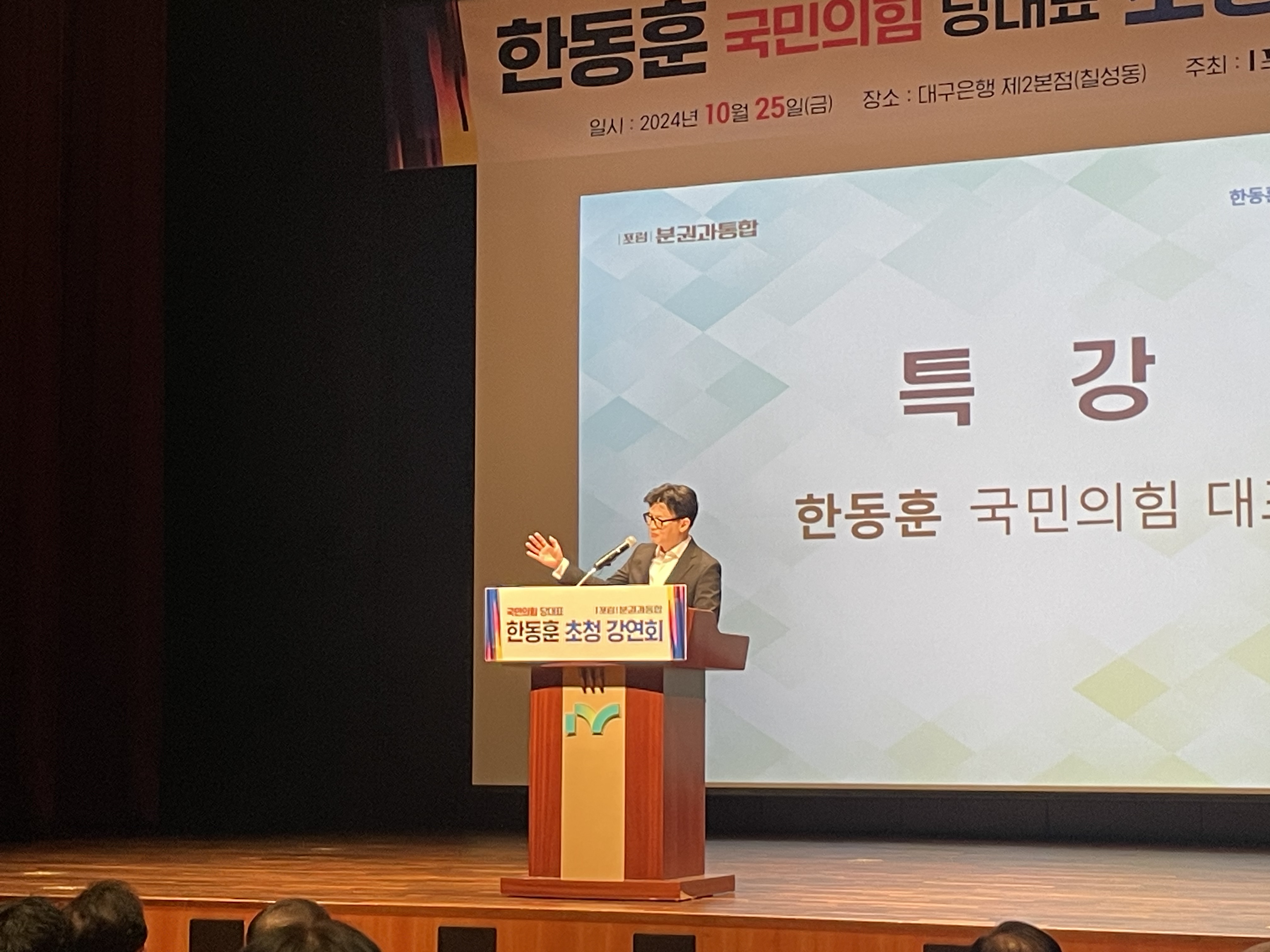 한동훈 국민의힘 대표는 10월 25일 대구에서 열린 '분권과 통합' 포럼에 강연자로 참석해 당의 변화와 쇄신을 강조했습니다.