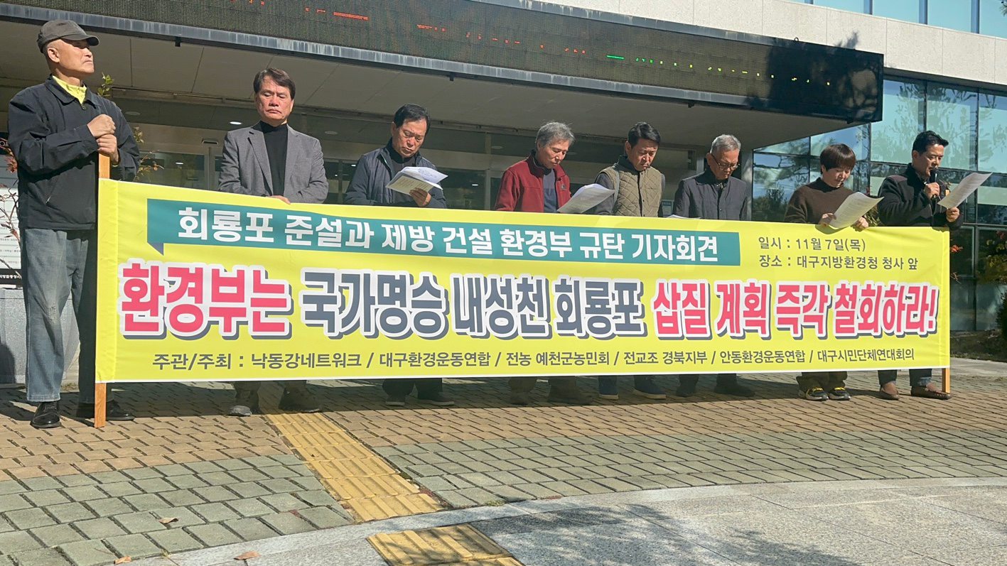 낙동강네트워크 등 6개 환경·시민단체들은 대구지방환경청 앞에서 기자회견을 열고,"지난해 경북 예천군 내성천 회룡포 마을 홍수는 인재로, 영수 댐으로 인해 홍수가 발생했기에 철저한 원인 규명 없이 회룡포를 준설하는 것은 문제가 있다"라고 비판했습니다.