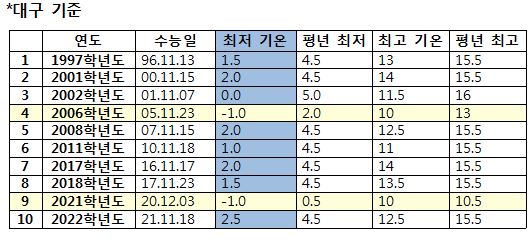 특히 영하로 내려갔던 수능일은 2006학년도와 2021학년도 단 두 번뿐이라는 사실! '수능 한파'라고 하기에는 추위가 약한 것 같지 않나요?