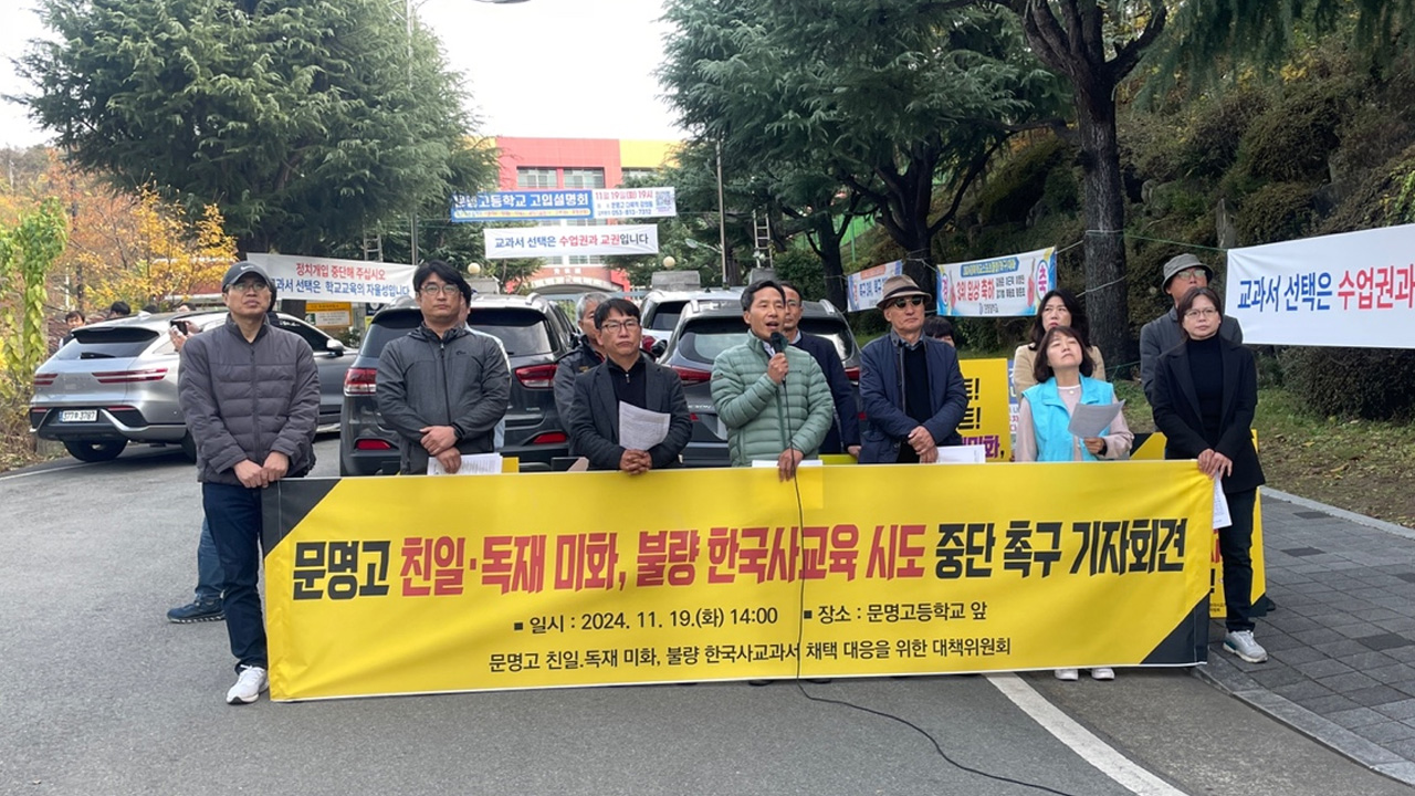 문명고 대책위는 "문명고는 지난 2017년 친일·독재를 미화하는 국정 역사 교과서 연구학교를 전국에서 유일하게 신청했다가 학부모와 시민사회 노동단체의 반대로 실패한 사실이 있는데 이에 대한 반성 없이 또다시 불량 한국사 교과서를 채택하고, 학생들에게 잘못된 역사 교육을 하려 시도하고 있다"라고 비판했습니다.