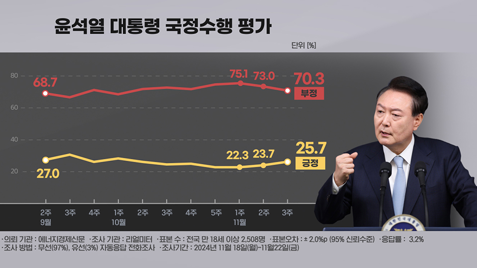 11월25일 발표한 한 여론조사 결과를 보면 윤 대통령 국정 수행에 대한 긍정 평가가 2주 연속 상승해 20% 중반을 회복했고 부정 평가는 2주 연속 하락해 70%를 기록했습니다.