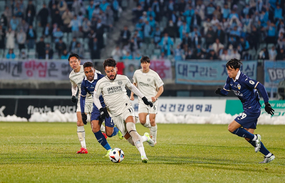 28일 저녁 천안종합운동장에서 펼쳐진 하나은행 K리그 승강플레이오프 충남아산과의 1차전에서 대구는 상대에 끌려가며 어려운 경기를 펼친 끝에 3-4로 경기를 마무리합니다.