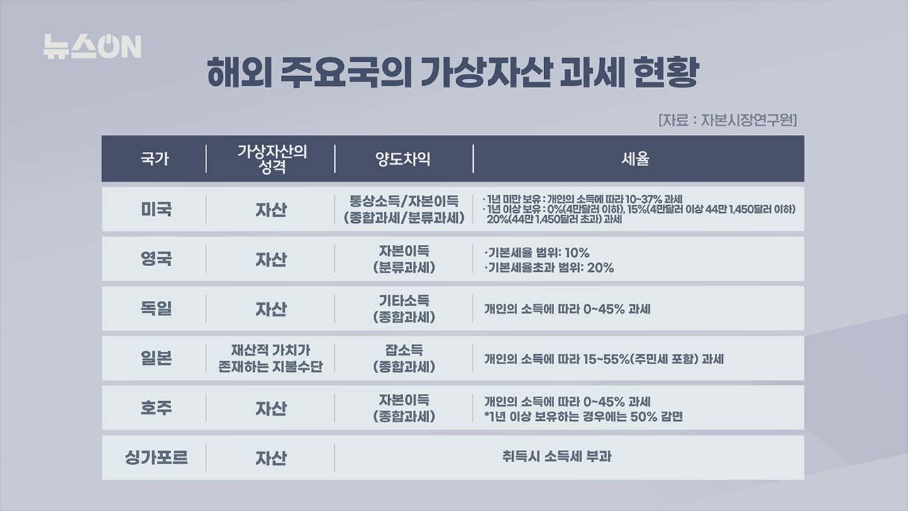 미국, 영국, 독일, 호주는 기본 세율이나 장·단기 투자에 따른 세율은 차이가 있지만 가상자산을 자산으로 분류해 과세하고 있고요.
