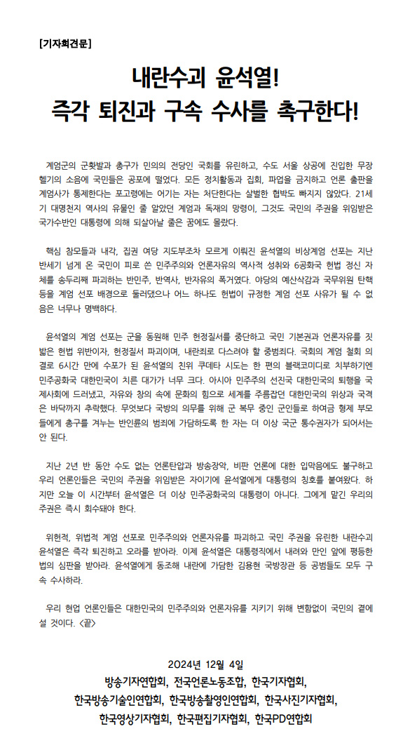 방송기자연합회와 전국언론노동조합, 한국기자협회 등 9개 현업 단체는 12월 4일 오전 서울 중구 프레스센터에서 기자회견을 열고 "윤석열 대통령의 계엄 선포는 군을 동원해 민주 헌정질서를 중단하고 국민 기본권과 언론자유를 짓밟은 헌법 위반이자 헌정질서 파괴이며 내란죄로 다스려야 할 중범죄"라고 주장했습니다.