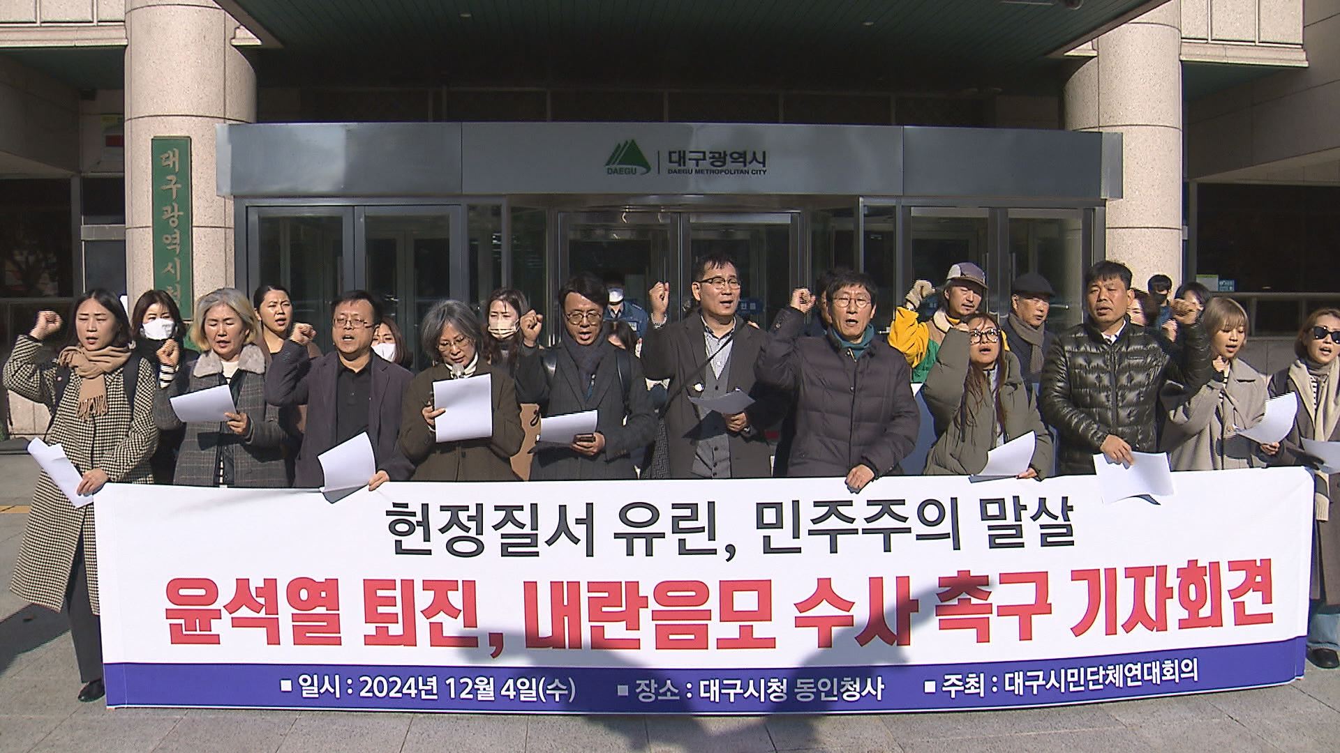 대구시민단체연대는 민주주의를 압살하려는 쿠데타와 다를 바 없다며 대통령 퇴진과 함께 관련자 모두 사법 처리를 촉구했습니다.