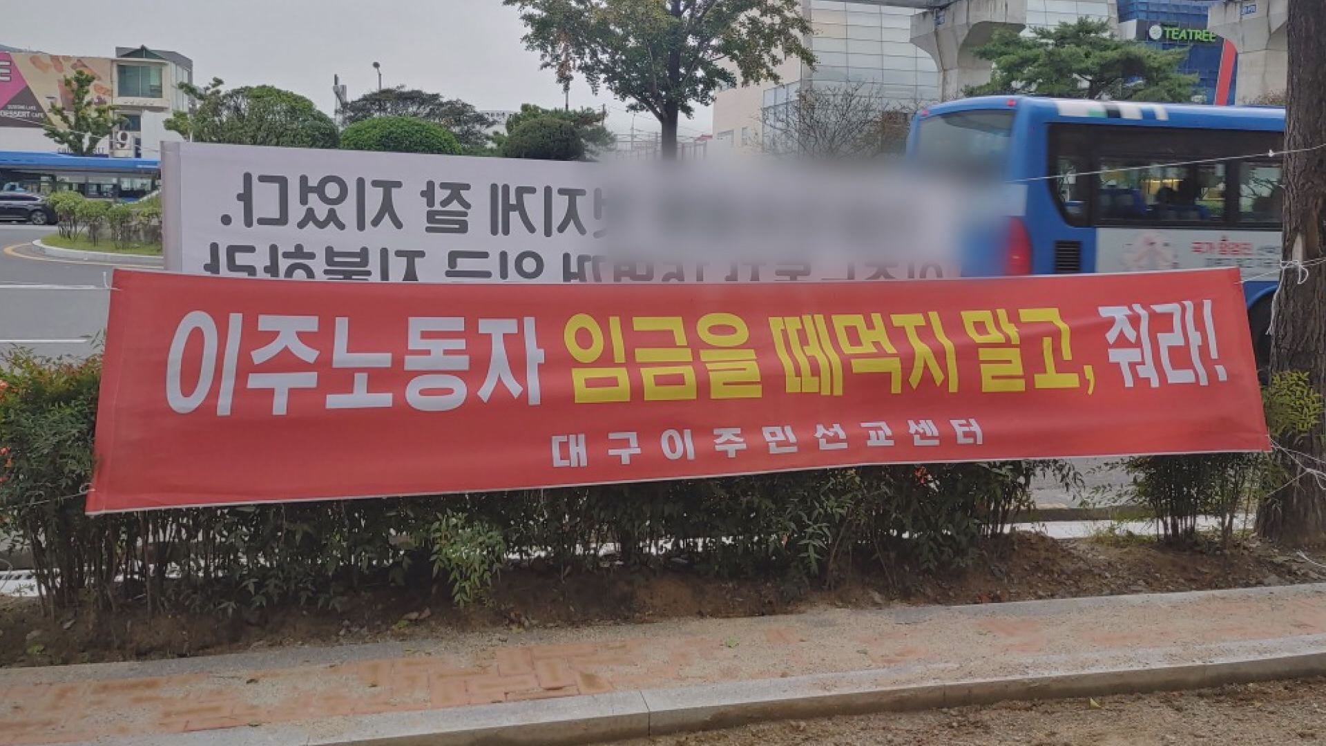 대구 아파트 앞에 붙은 현수막 "이주노동자 임금을 떼먹지 말고 줘라"
