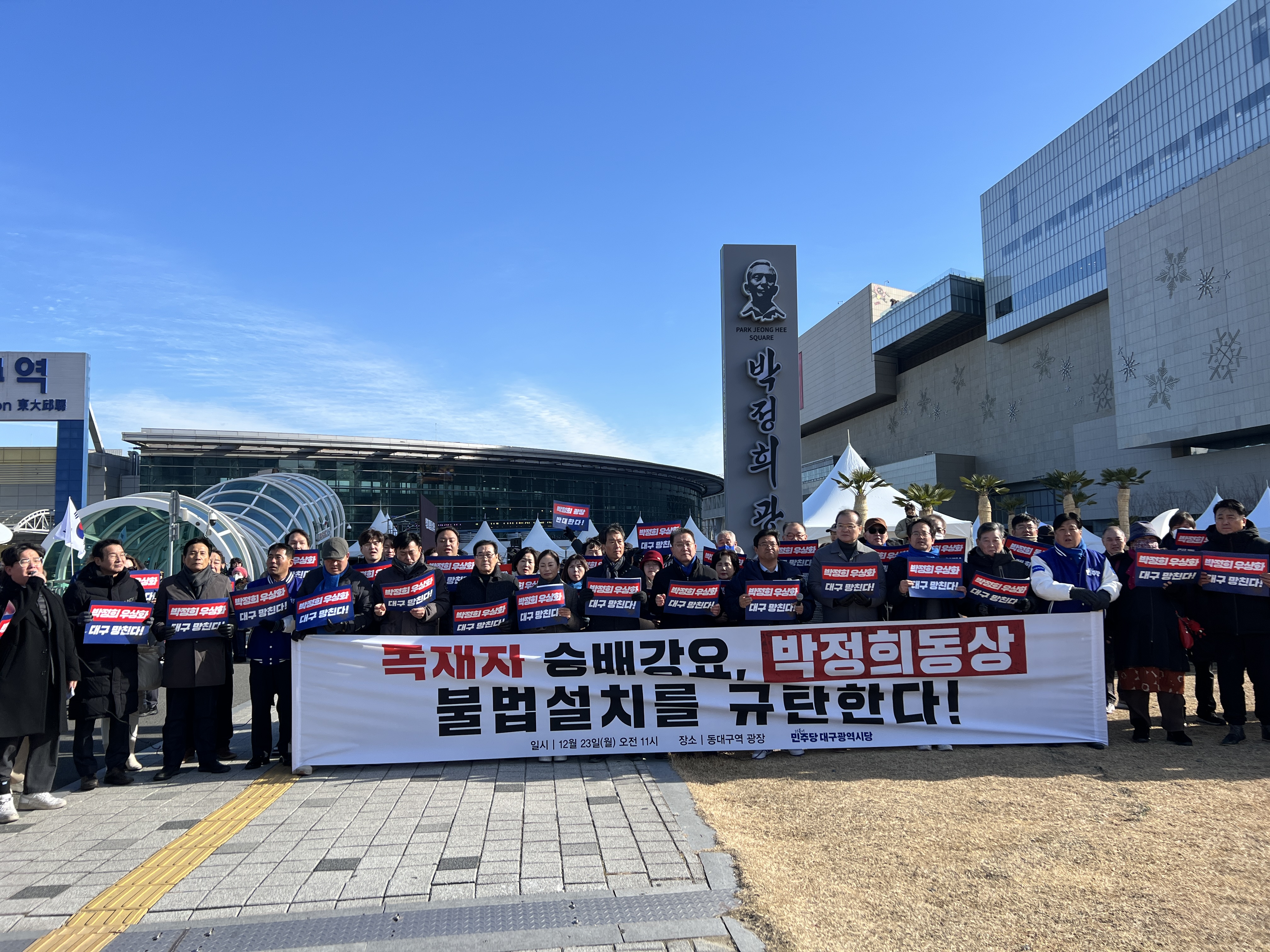 더불어민주당 대구시당은 12월 23일 오전 동대구역 앞에서 '박정희 동상 불법 설치 규탄 대회'를 열었습니다.