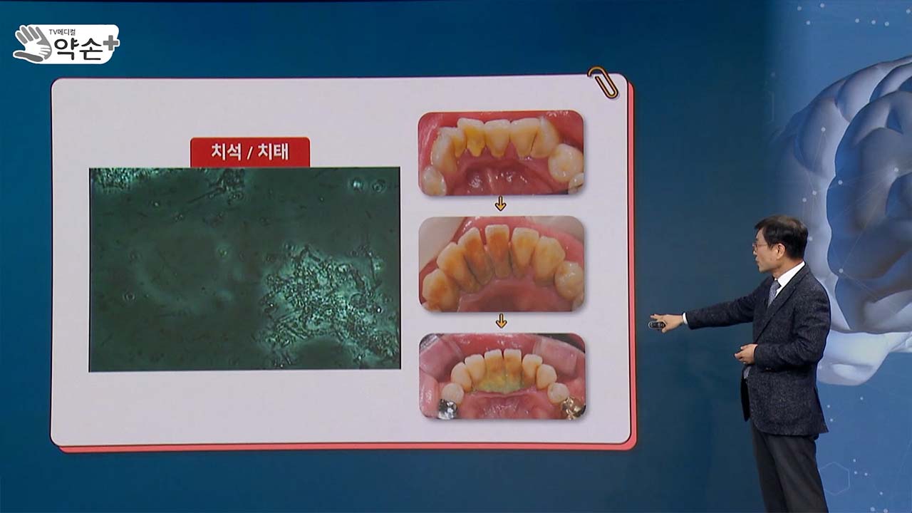 오른쪽에 보시면 치석이 치태로 인해 석회화가 되면서 진행되고 있는 과정을 순서대로 볼 수가 있는데요. 아주 심하게 되면 아랫부분처럼 보입니다. 어떤 분은 이 부위가 자기 치아인 줄 아는 분이 있는데, 이 부분을 전부 치석이라고 보시면 되고요. 치아 주위에 있는 이 부분은 반드시 제거해야 합니다.