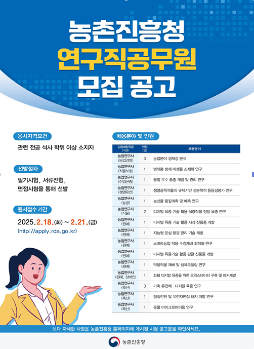 농촌진흥청이 2025년도 연구직 공무원 경력 경쟁 채용 선발 계획을 공고했습니다.