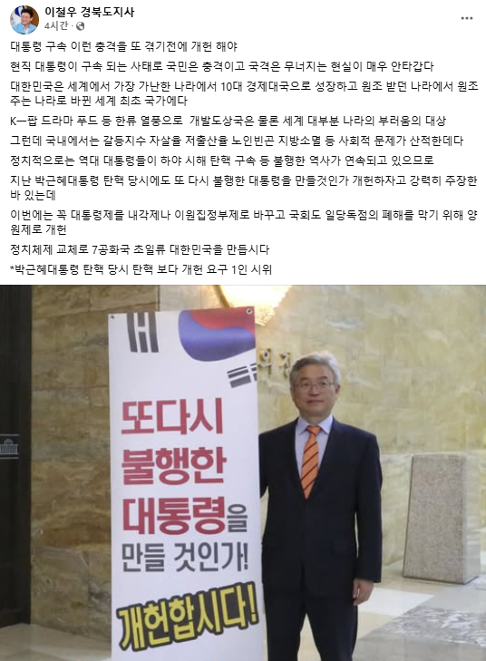이 지사는 19일 자신의 SNS에서 "대통령 구속 이런 충격을 또 겪기 전에 개헌해야 한다"면서 이같이 말했습니다.